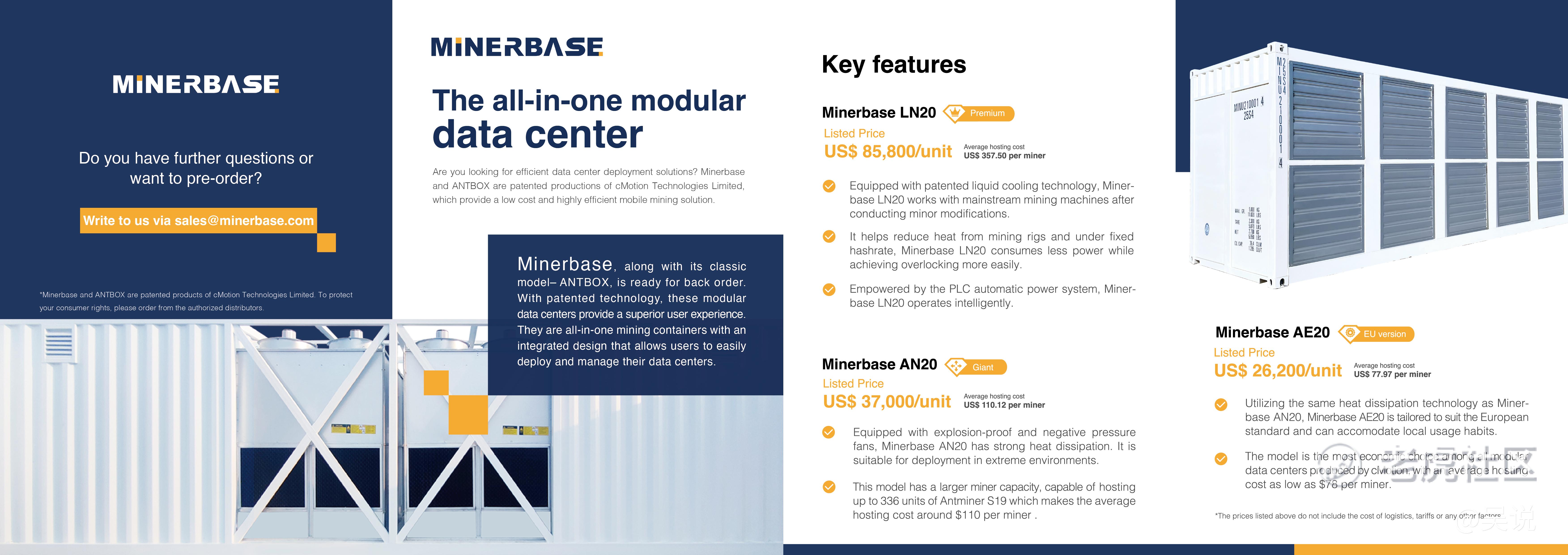 当然不论结果如何,在这场挖矿行业的装备竞赛中优秀的产品总能取得先机,最终推动整个行业的发展。如同芯片从 16nm 不断迭代为 7nm、5nm,矿场建设从土建式逐渐转为集装箱式,冷却方式从风冷进化为液冷,这种技术上的进步总会使得矿主们挖矿的效率越来越高。Minerbase 团队是行业领先的数据中心及软件技术服务提供商,在全球范围内拥有超过 160 名员工,团队成员来自腾讯、华为、阿里巴巴、比特大陆等知名企业,积累了丰富的软件、硬件技术储备,在集装箱数据中心领域掌握多项核心技术专利。2022 年7 月,发布全新集装箱数据中心产品 Minerbase LN20、AN20、AE20。