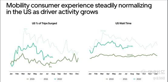 观测到截止到最近一个月的数据来看,并且因为打车需求高于司机的供给,导致美国打车平均等到时间几乎是19年的2倍。