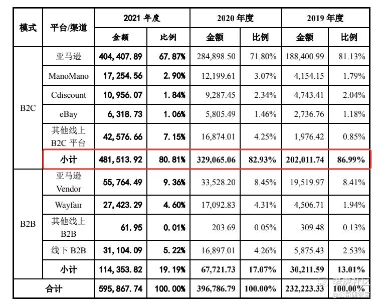 2019年到2021年,致欧通过亚马逊渠道获得的收入(B2C+B2B)分别为20.79亿、31.84亿、46.02亿,收入占比分别为90%、80%、77%。