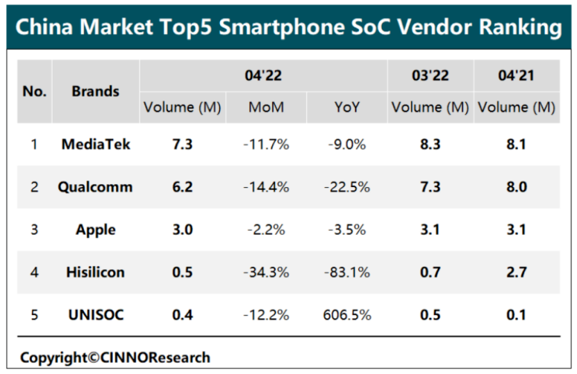 市场调研机构CINNO Research发布的数据显示,国内智能机SoC市场4月终端出货量降至约1760万颗,同比下降约21.6%,环比下降约12.1%。