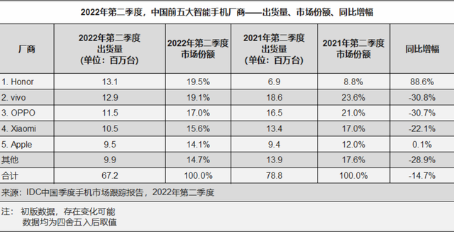 国际数据机构IDC于7月29日公布的手机季度跟踪报告显示,2022年第二季度,中国智能手机市场出货量约为6720万台,同比下降14.7%。荣耀、vivo(含iQOO)、OPPO(含Reno)分别以19.5%、19.1%和17.0%的市场份额位列前三,小米和苹果分列第四、第五位。