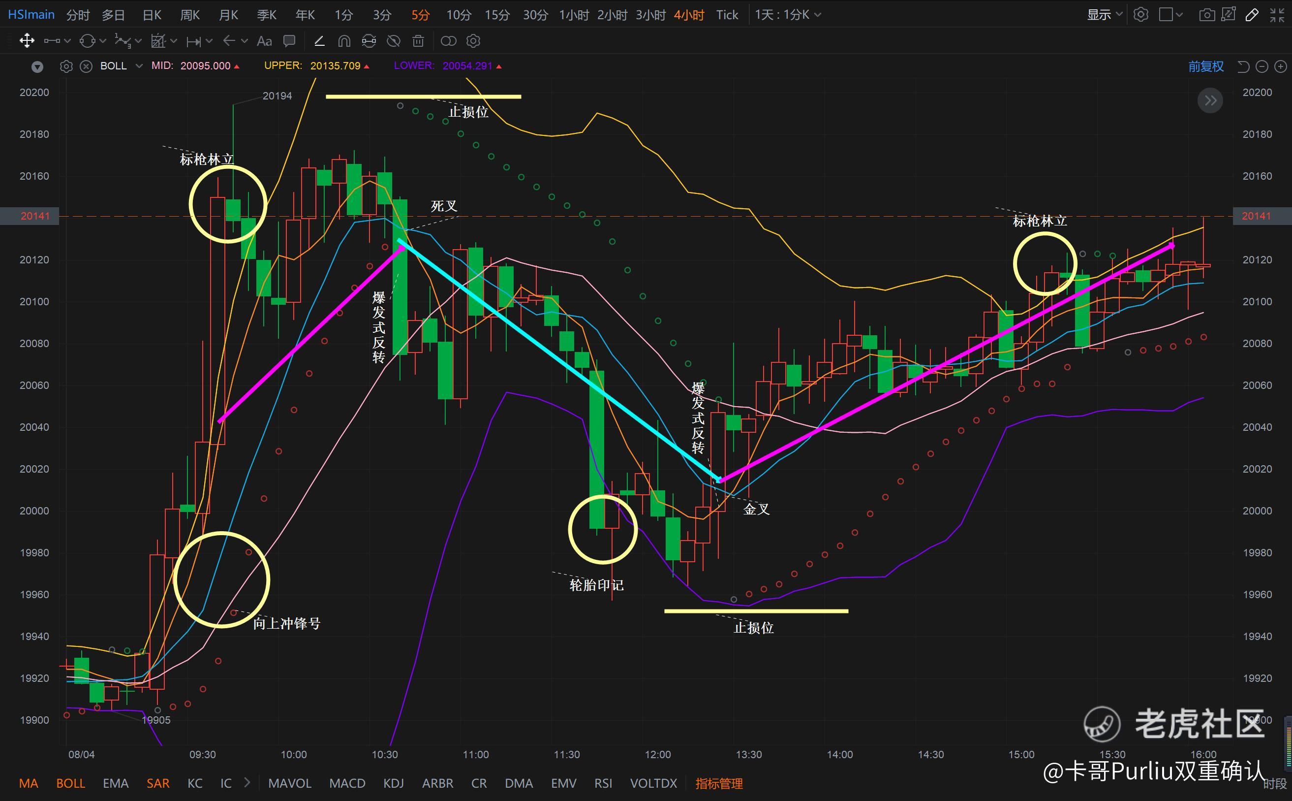 ——今天恒指期货起步是“向上冲锋号”,9点半牛熊证开市,继续上涨,之后入场开仓牛证;大幅升高后,出现“标枪林立”,再进入布林线界内,震荡横盘,直到出现5、10均线死叉,平仓牛证。