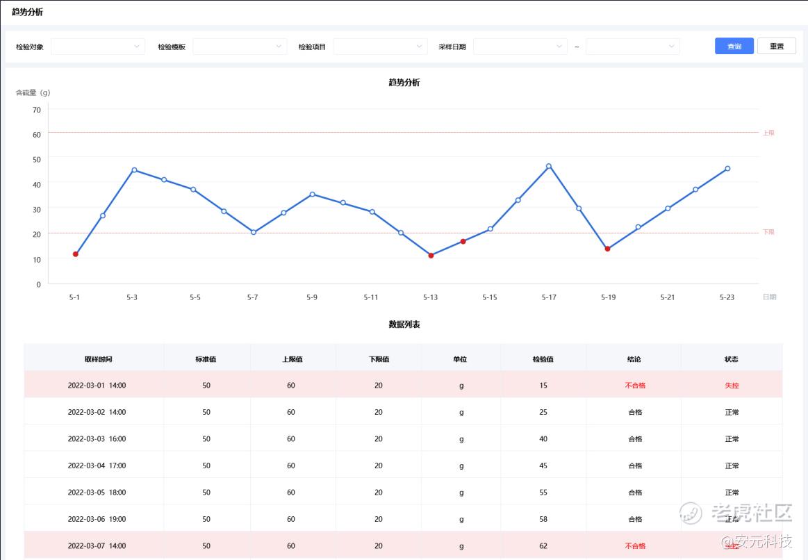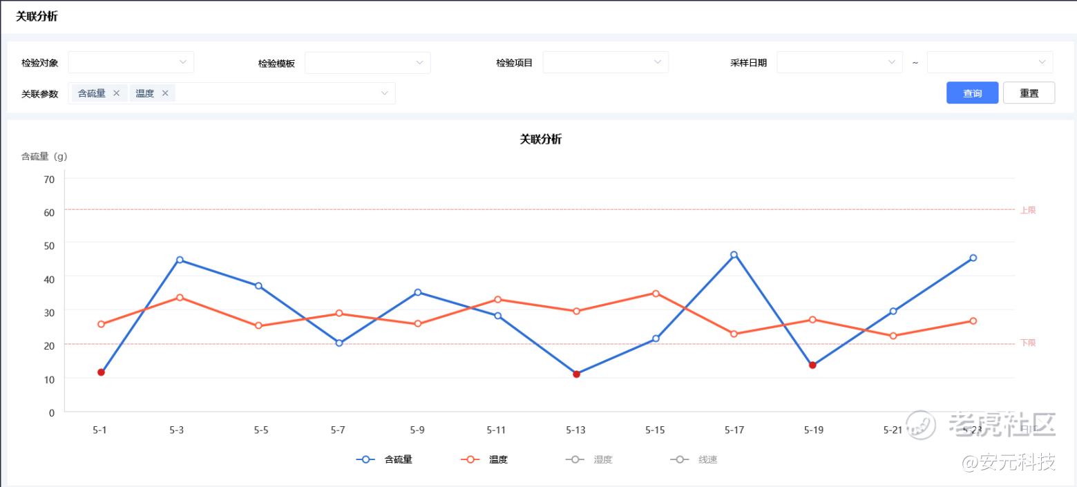 对于检测得到的结果,系统提供多维度的统计分析与质量控制管理,可实现对数据的横向和纵向的查询;可通过趋势分析与相关性分析判断过程质量的控制水平,便于企业进行质量管理控制。