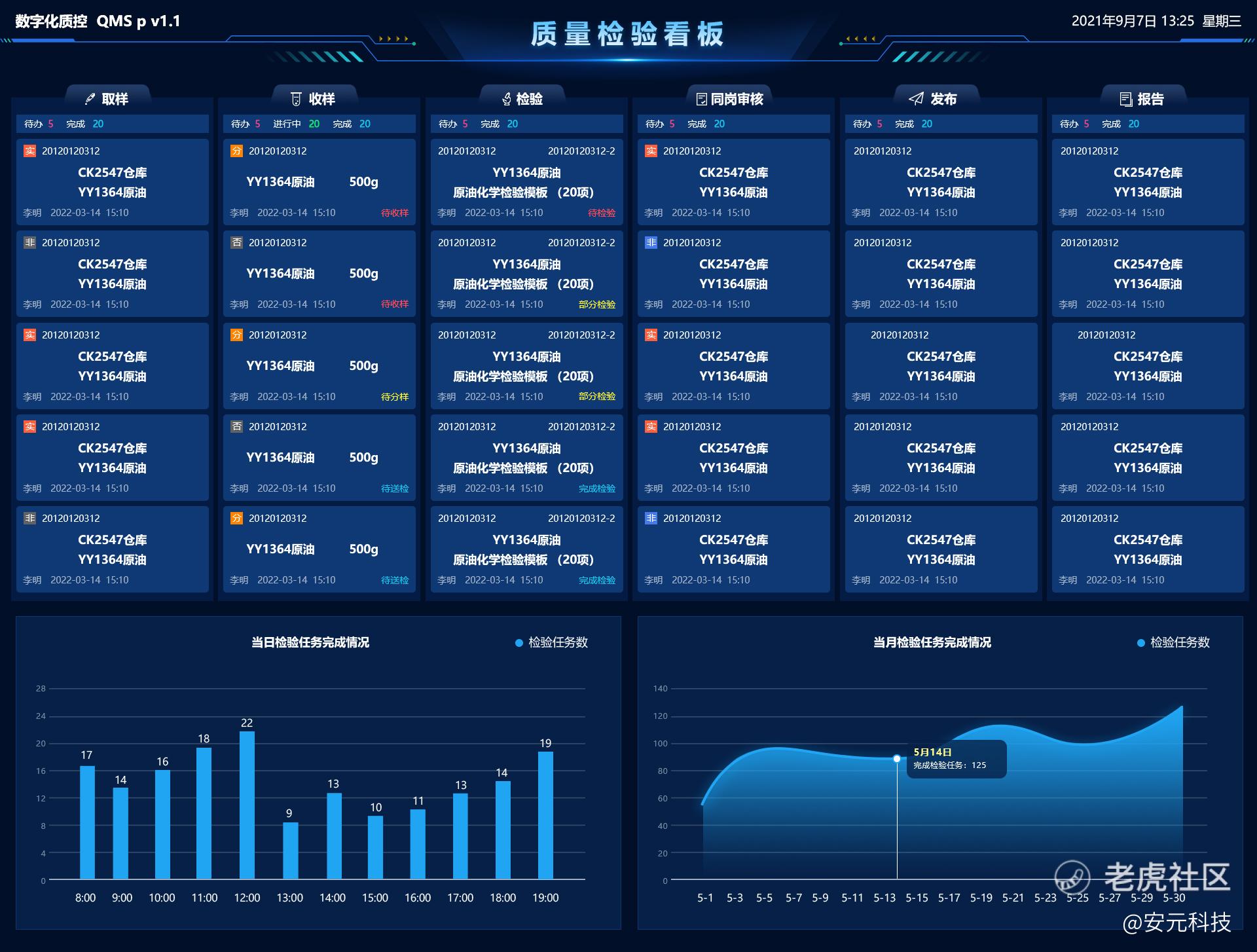 同时,检测人员可通过质量检验看板,实时查看各个检验节点的检验任务信息,一目了然整个检验过程。