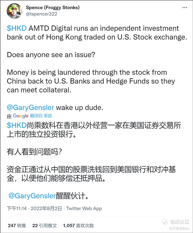 目前,Twitter上关于尚乘数科讨论最多的帖子显示,这家公司有着非常明显的“妖股”特点。这位网友指出,尚乘数科可能存在xiqian行为,他还不忘提醒SEC现任主席,“尚乘数科在香港以外经营一家在美国证券交易所上市的独立投资银行。 有人看到问题吗? 资金正通过从中国的股票xiqian回到美国银行和对冲基金,以便他们能够偿还抵押品。@GaryGensler醒醒伙计”。