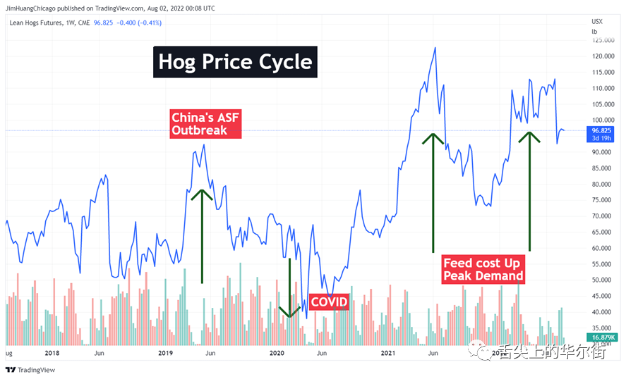 首先是猪周期。今年的高价将使明年供应增加,猪价下跌。其次,随着恶性通胀和即将到来的衰退,生猪需求将出现替代效应。消费者会选择低价的动物蛋白,比如鸡肉,同时减少猪肉需求。最后,中国生猪供应增加,猪肉进口减少是利空美猪的一大因素。