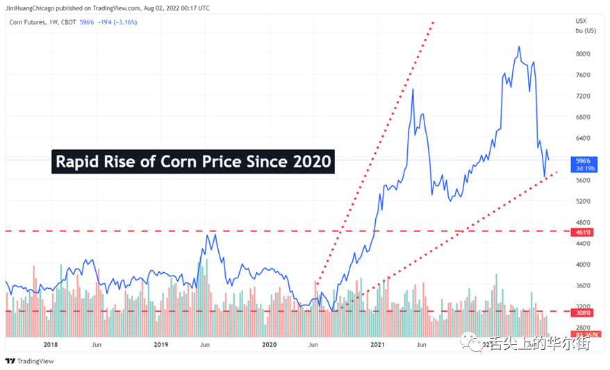 我们可以进一步研究玉米价格走势。玉米期货的价格通常为每蒲式耳3美元至4.50美元,但在2021年5月飙升至7美元。今年4月,它再次打破记录达到每蒲式耳8美元。我预计玉米价格会下跌,但仍高于去年的水平。