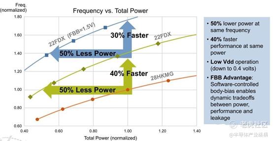 从图中可以看出,在同样频率下,采用22FDX(不做bias)工艺的功耗比28nm HKMG节省了近50%,而采用同样频率和工艺的22FDX,有FBB(Forward Body Biasing)的功耗比没有采用偏压技术的节省了近50%的功耗。