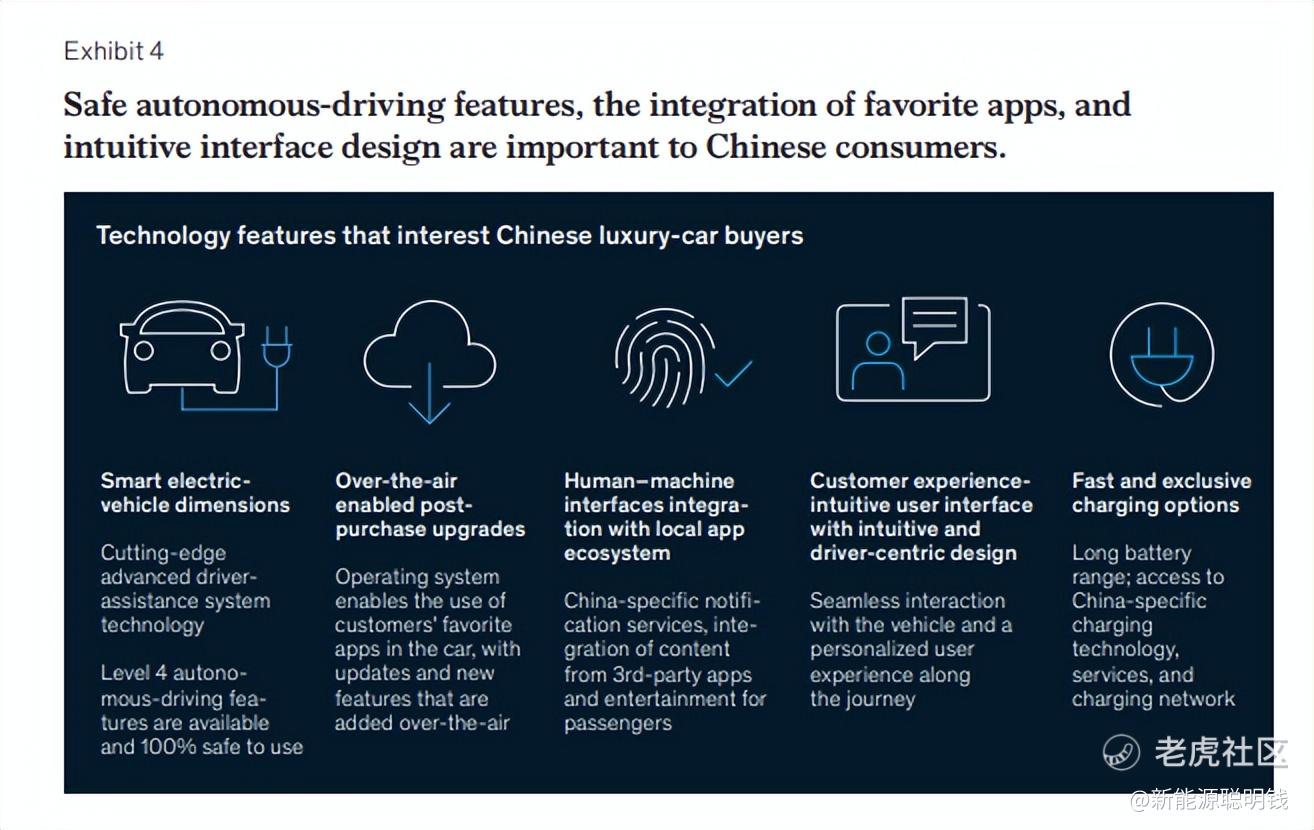 除了预期中的电动化之外,中国豪华车消费者对“智能化”也几乎等量齐观。大约40%到50%对电动车有真实意向的消费者认为最先进的ADAS和车联网功能是必备的。目前,多达20%的中国购车者认为,新的电动车制造商在智能化方面比老牌汽车制造商做得更好,这是传统车企需要弥补的一个差距。