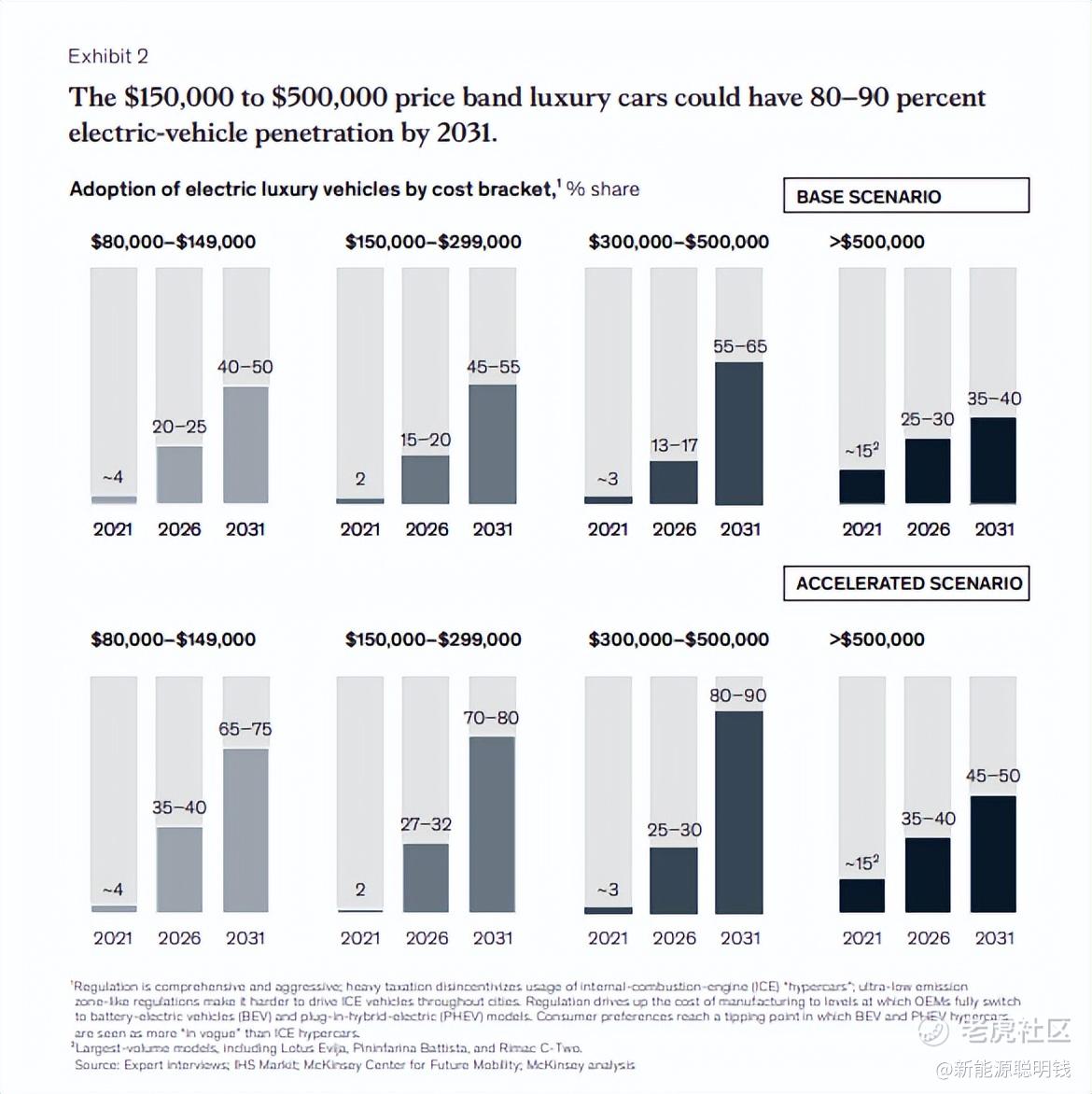 在30万-50万美元细分市场,电动车将有更大发展。8万到14.9万美元豪华车市场的年销量将在2031年达到300万台,同时电动车渗透率达到65%-75%(表2)。由于供应限制,价格在15万到29.9万美元之间的电动车在最初几年可能会有一定的增长滞后,到2026年电动车渗透率将达到30%左右,到2031年将上升到75%左右。30万到50万美元间的市场也将落后于其他细分市场,预计2026年的渗透率将达到25%-30%,但到2031年将上升到85%左右。到2026年,价格在50万美元以上的市场很可能与价格在8万到14.9万美元间的市场类似,电动车普及率估计在35%到40%之间。然而,向电动车的长期过渡将较为缓慢,因为燃油车仍可被酌情选择,并具有体验性价值,仍将受到欢迎。