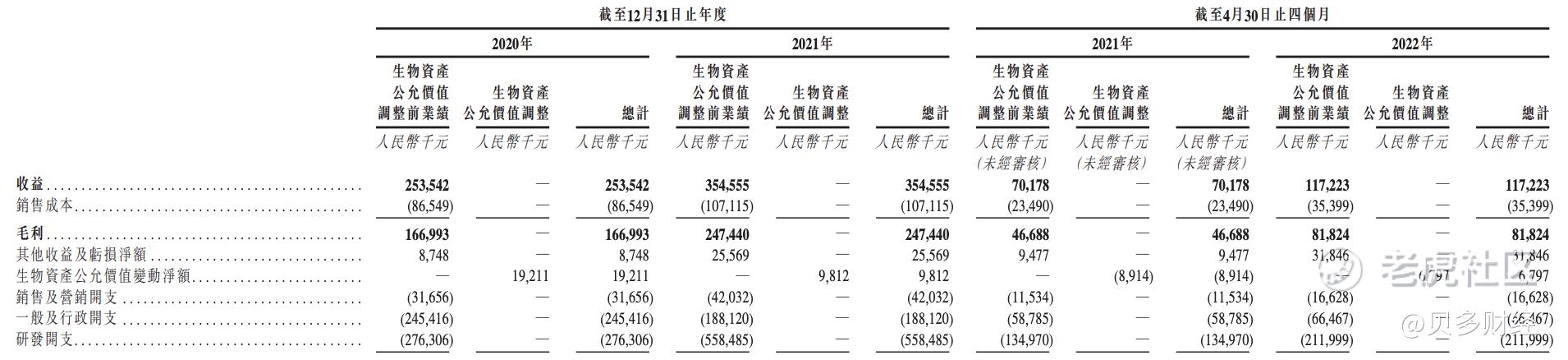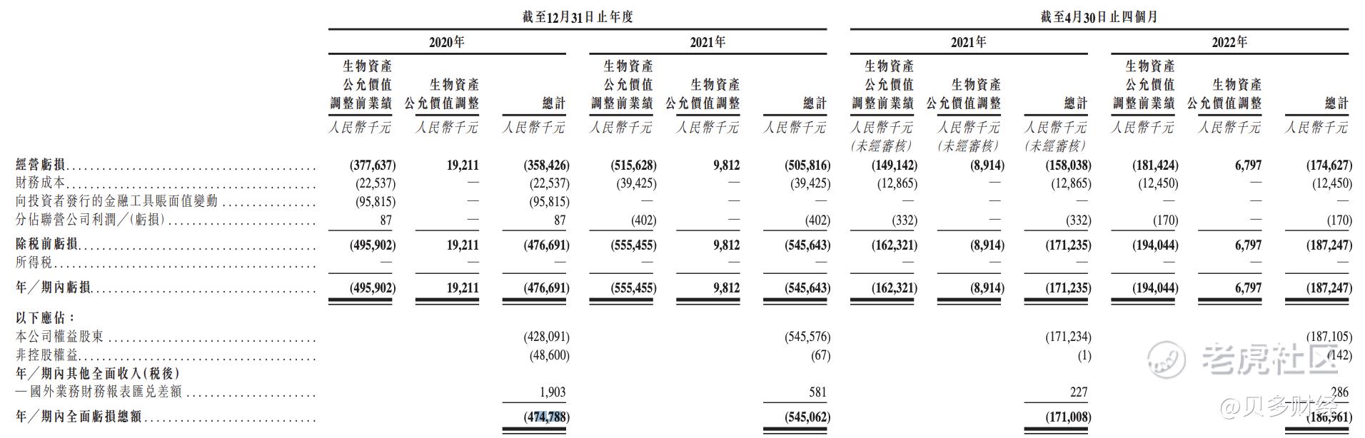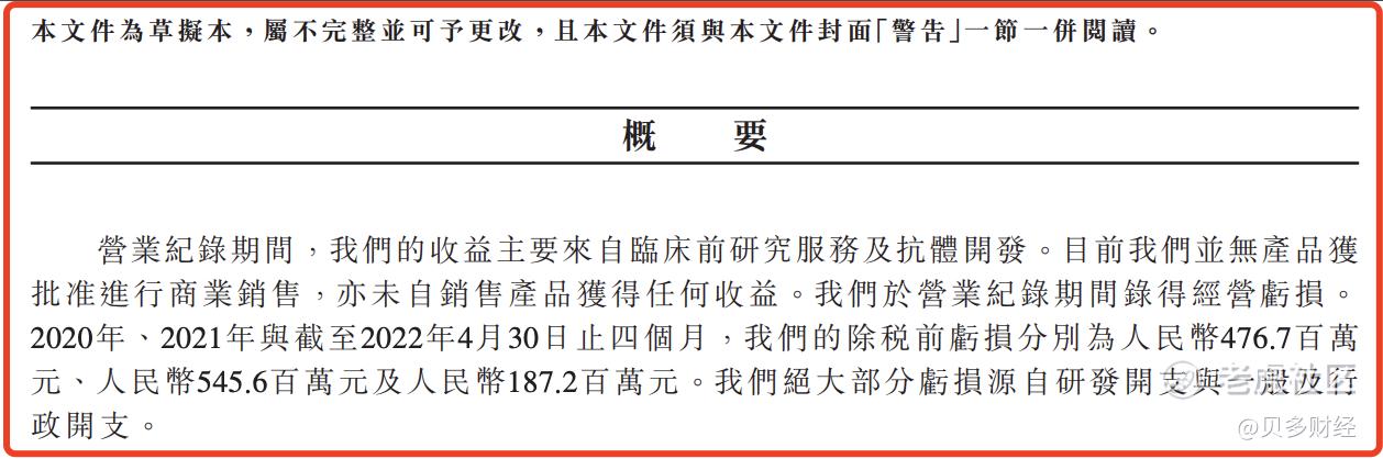 2020年、2021年,百奥赛图的收入分别约为2.54亿元、3.55亿元,对应的净亏损分别为4.75亿元、5.45亿元;2022年截至4月30日止四个月,百奥赛图的收入为1.17亿元,净亏损1.87亿元。