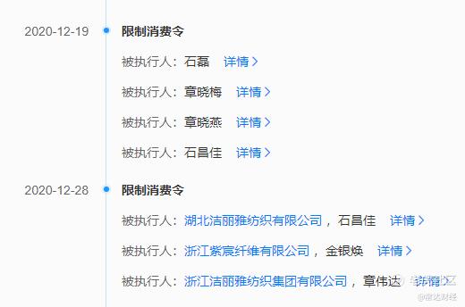 作为洁丽雅第一大股东,浙江洁丽雅毛巾有限公司也数次被执行。其中,因与广发银行股份有限公司杭州分行纠纷,浙江洁丽雅毛巾有限公司股东石磊、石昌佳曾被限制高消费。而石磊系洁丽雅第一大股东、董事长。