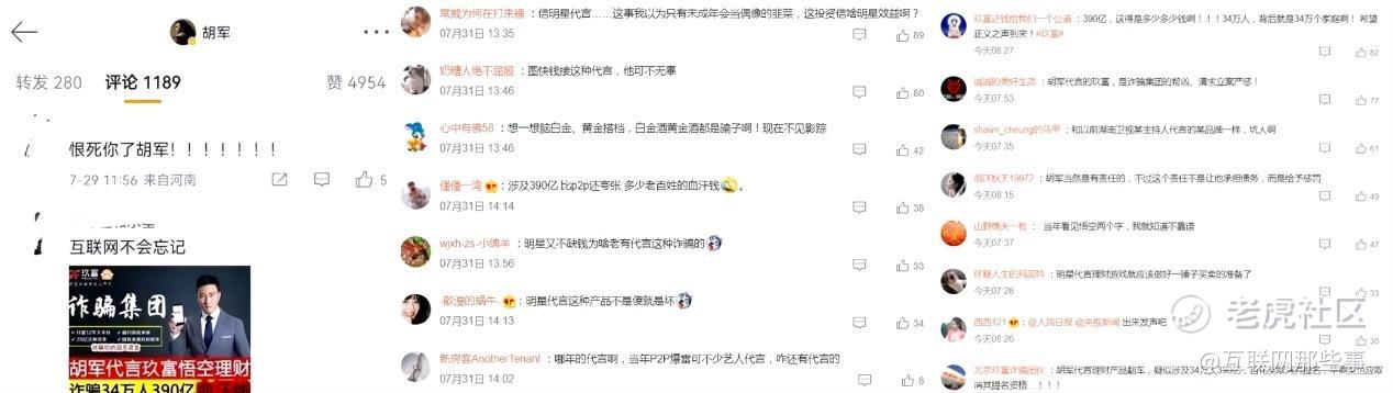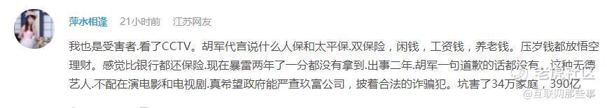无独有偶,在网络上,也有不少网友发贴留言,“表示看到了电视台的广告宣传和胡军的代言,才最终投资,没想到血本无亏,出事2年了,胡军连一句道歉都没有,这种无德艺人,不配演电视剧和电影……”