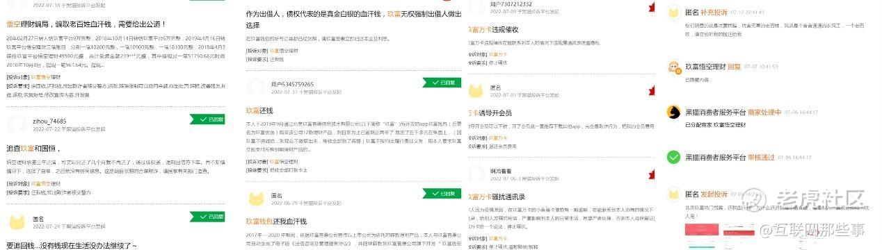 时至今日,在黑猫投诉平台,有关玖富旗下的产品的投诉仍高达数万条,这些投诉中的绝大部分都与理财逾期、理财骗局和暴力催收相关,很多投诉,玖富回复一条后,也就没有下文了,可以说,这些投资理财上当的用户,一度是维权无门。