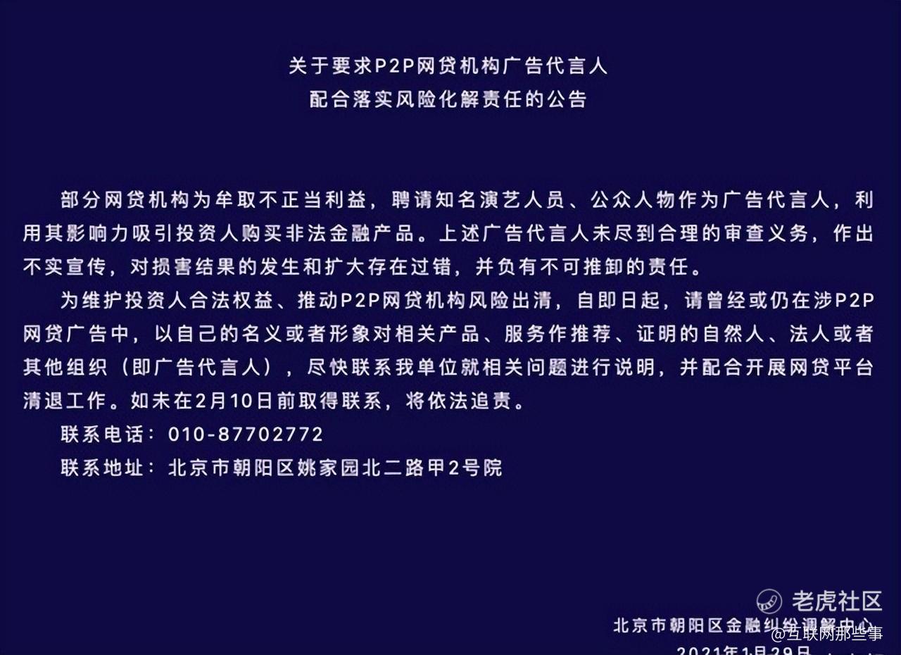 值得一提的是,早在2021年1月,相关部门就已经发出了要求P*P网贷机构广告代言人配合落实风险化解责任的公告,其中明确提及“利用个人影响力吸引投资人购买非法金融产品,对损害结果的发生和扩大存在过错,并负有不可推卸的责任”