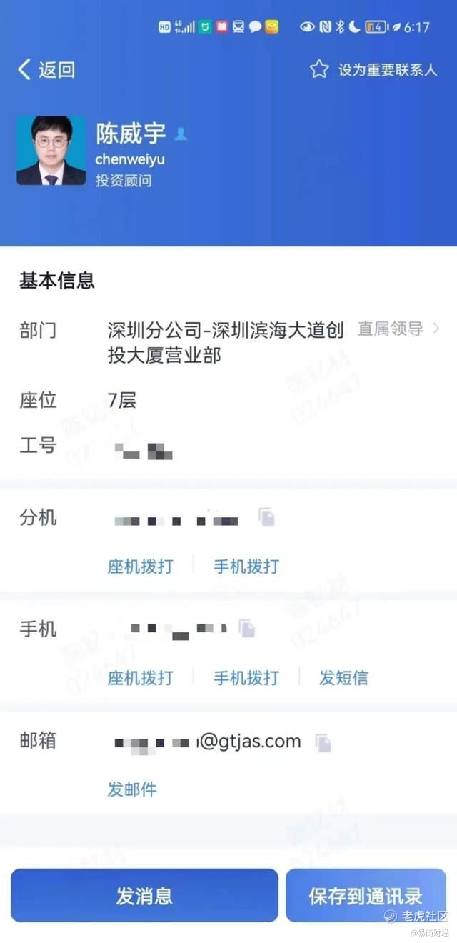 据界面新闻介绍,这位陈威宇为90后,硕士毕业生,就职于国泰君安深圳分公司,滨海大道创投大厦营业部,是该营业部的投资顾问。
