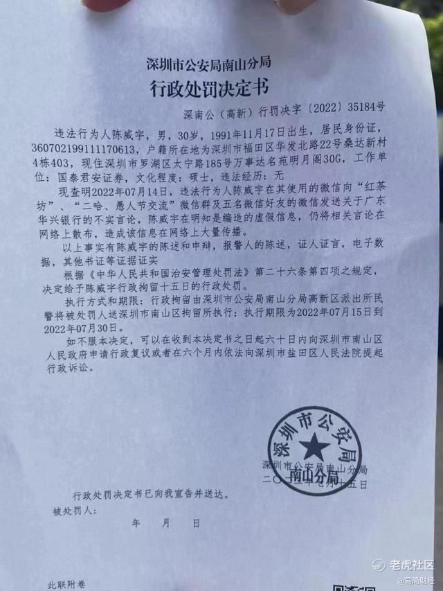 《决定书》显示,违法行为人陈威宇在其使用的微信,向“红茶坊”、“二哈、愚人节交流”微信群及五名微信好友的微信,发送关于广东华兴银行的不实言论,陈威宇在明知是编造的虚假信息,仍将相关言论在网络上散布,造成该信息在网络上大量传播。