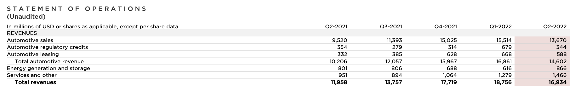 特斯拉期内实现营收169.34亿美元,同比上升42%,环比下滑10%。其中汽车部分营收为146亿美元,与去年同期的102亿美元相比增长43%,环比下滑13%。相信对于很多关于特斯拉的朋友来说,这个数字并不意外。疫情影响了上海复工,导致特斯拉产销量显著下滑。早在7月初,特斯拉就曾公布2季度交付数据。根据数据显示,特斯拉在2季度交付了总计254000辆汽车,包括16162辆Model S/X,以及238533辆Model 3/Y,较去年同期增长26.2%,环比下滑18%,低于分析师预期的35万辆。