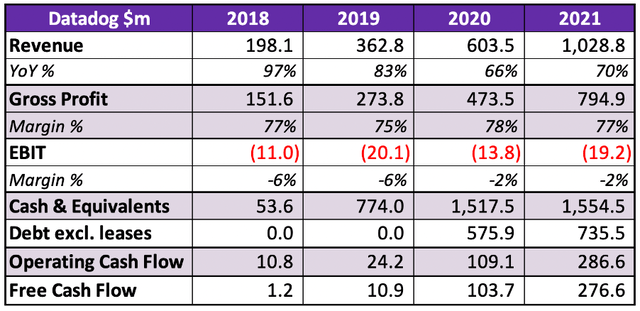 Datadog是一家财务稳健的企业,收入一直在快速增长。从2018年到2021年,收入以惊人的73%的复合年增长率增长——同时产生超过75%的毛利率!它可能仍会看到略微负的息税前利润,但当一家公司的自由现金流为正、资产负债表强劲并且正在对自身进行再投资以实现增长时,我并不担心。