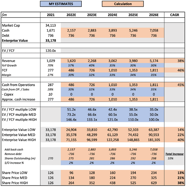 此外,我预测Datadog的自由现金流利润率将在2026年逐渐扩大至35%。该公司仍有提升空间,过去12个月的FCF利润率已经达到30%(2021年为27%)。管理层还预计 Datadog的调整后净利润率将在2022年大幅改善,因此FCF利润率逐步扩大的预期也是合理的。