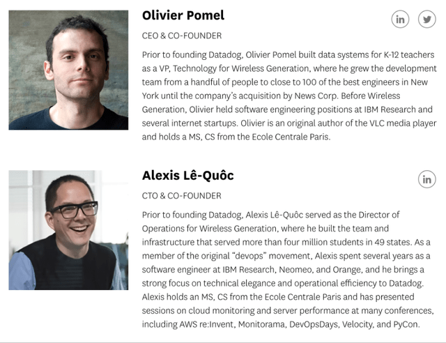 谈到快节奏的创新公司,我的目标始终是找到由创始人领导的内部所有权较高的企业。很高兴地我在Datadog的领导团队中得到的不是一个,而是两个联合创始人——首席执行官 Olivier Pomel和首席技术官Alexis Lê-Quôc。