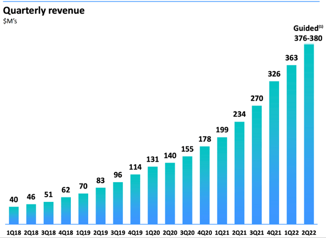 Datadog还建立了强大的商业模式,利用品牌和技术优势来吸引客户,利用转换成本不断推出新产品,让客户留在平台上,同时花费越来越多的钱。这种商业模式使公司的收入趋势看起来像这样: