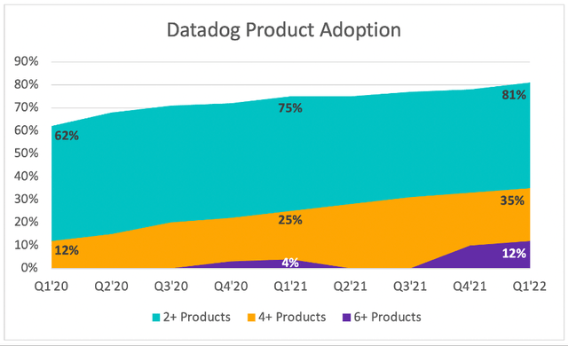 在过去的两年里,Datadog 看到使用2+产品的客户数量从62%增加到81%,使用4+产品的客户数量从12%增加到 35%,虽然第一季度没有报告,然而现在使用超过6种产品的客户数量占12%。
