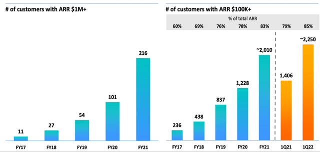 鉴于此,使用Datadog平台的客户数量迅速增加也就不足为奇了。更重要的是,ARR(年度经常性收入)超过10万美元和超过100万美元的客户数量在2021年都在加速增长,使Datadog能够继续保持高速增长模式。