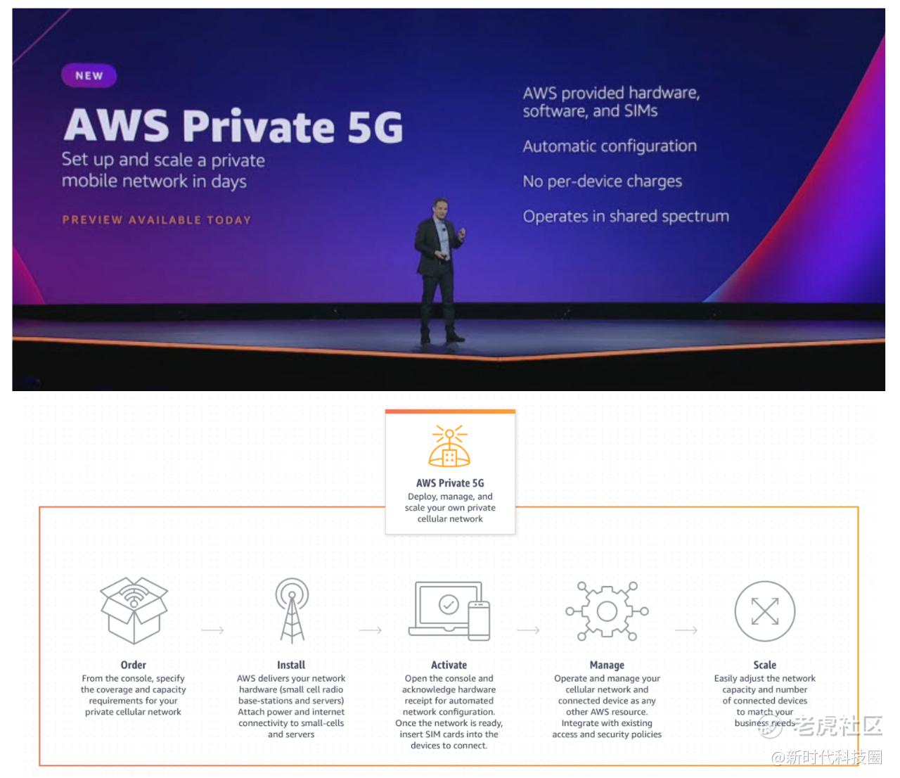 AWS提供包括SIM卡、Small Cell RU、DU/CU、5G Core、服务器的端到端5G专网解决方案。重要的是,这是一个预集成解决方案。