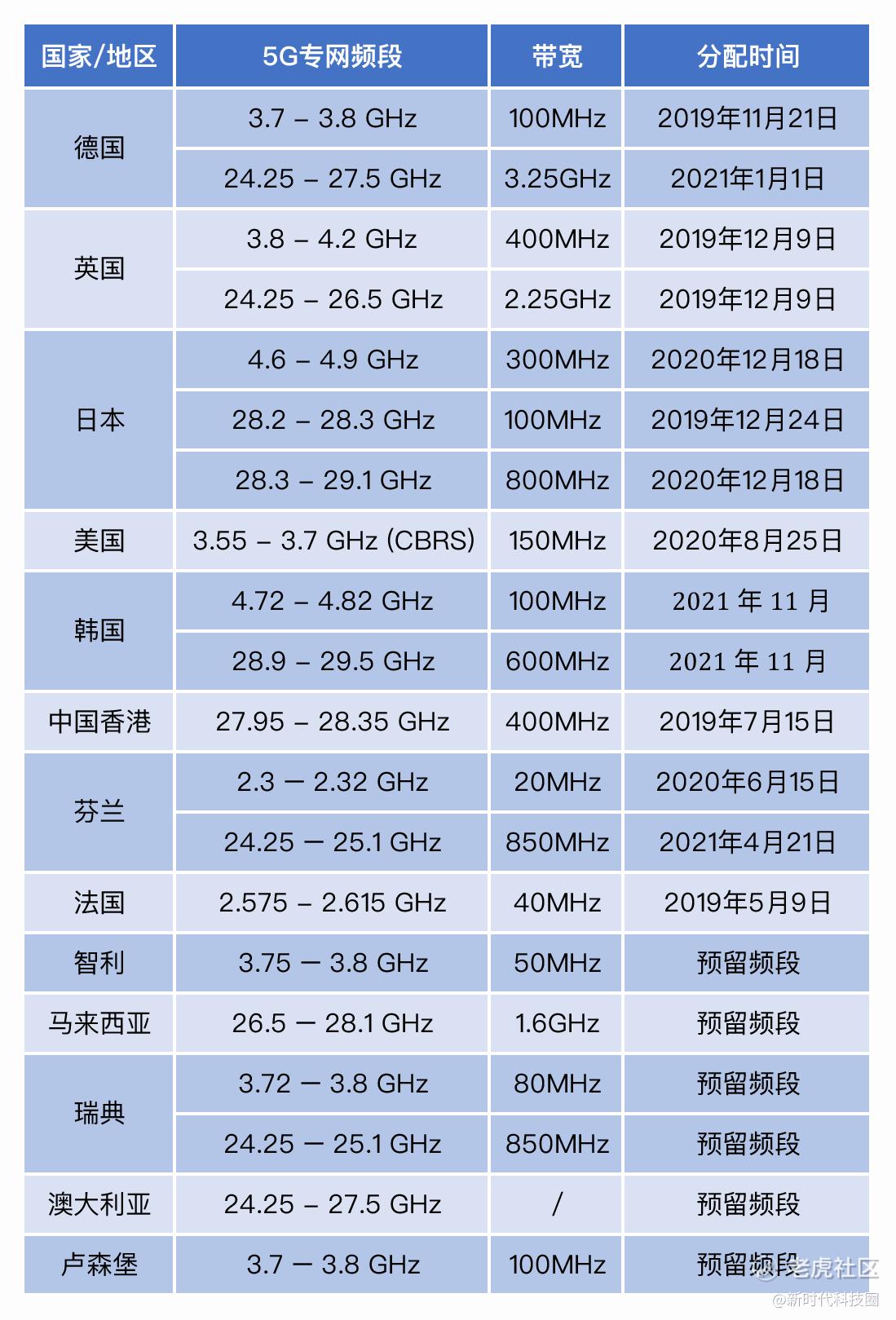 为加快推动实现工业4.0,德国在2019年11月和2021年1月分别为工业领域分配了 3.7-3.8GHz和24.25-27.5GHz范围的5G专网频段,企业申请获批就可使用。