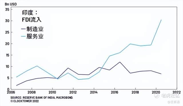 Clocktower Group数据显示,自 2015 年以来,流入印度的大部分直接投资集中在以计算机和互联网为代表的服务业,仅有很少一部分流向制造业。