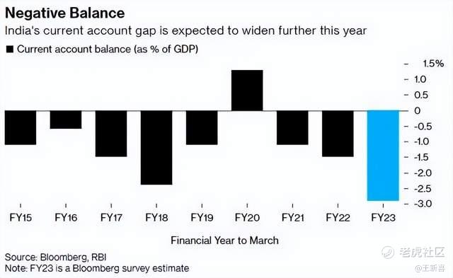 彭博社在6月底的一项调查显示,在截至明年3月31日的财政年度中,印度经常账户赤字占国内生产总值(GDP)的比重可能会扩大到2.9%,几乎是前一年水平的两倍。在国内外通胀压力下,印度四年来已经首次加息。