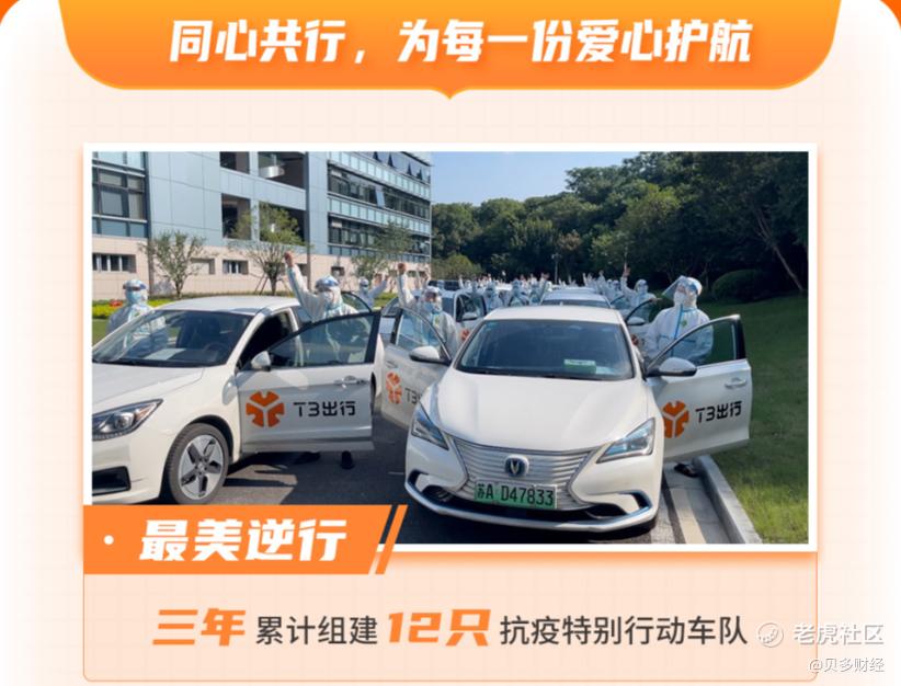 一方面,面对突如其来的新冠肺炎疫情,T3出行迅速在武汉、南京、长春、成都、重庆、苏州、天津、济南、青岛、海口等城市组建了12支抗疫特别行动车队,召集志愿者司机共计1200多名,累计免费服务超260个社区共50万人次疫情期间出行需求。