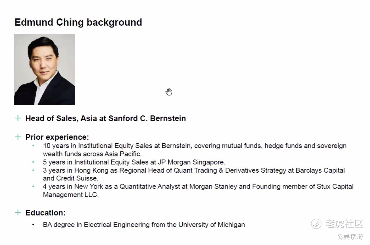 自威灵顿管理公司波士顿和伦敦资深董事总经理、道达尔能源全球首席投资官、马来西亚主权基金外部基金经理团队主管等行业大拿为我们团队提供有力支持之后。今天,具有深厚买方DNA与渊源的精品股票投研机构「Sanford C. Bernstein Research」的亚洲与环太平洋大区销售一把手也亲自前来做客,一样通过Guest Speaker session,为我仅有9个人的小团队提供了高质量的辅导。