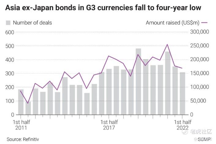 Refinitiv的数据显示,2022年上半年以G3货币(包括美元、日元和欧元)计价的债券发行规模同比下降34%,至1690亿美元。