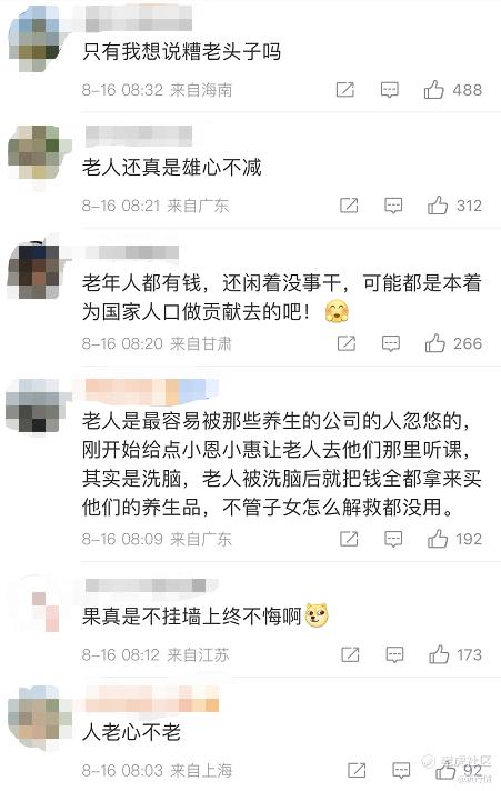 此事经媒体报道后,很快登上了微博热搜。大部分网友的看法还是正常的,但也有些画风跑歪了:“老人为啥吃这个”“还真是雄心不减”“自作自受”……