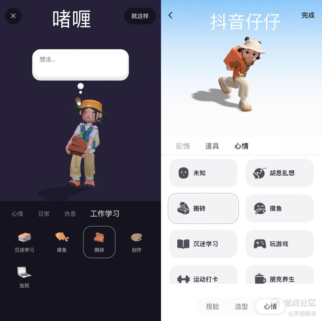 再比如心情页面,啫喱当初主张真实还原用户状态,用户可在“大厅”社交,通过虚拟形象的想法、动作等表达自己的状态,比如“摸鱼”、“搬砖”等,这是啫喱的一大功能亮点。在抖音仔仔,啫喱的这一功能同样被做了一遍,虽然有增加一些心情,但像“摸鱼”、“搬砖”这些都借鉴了啫喱。