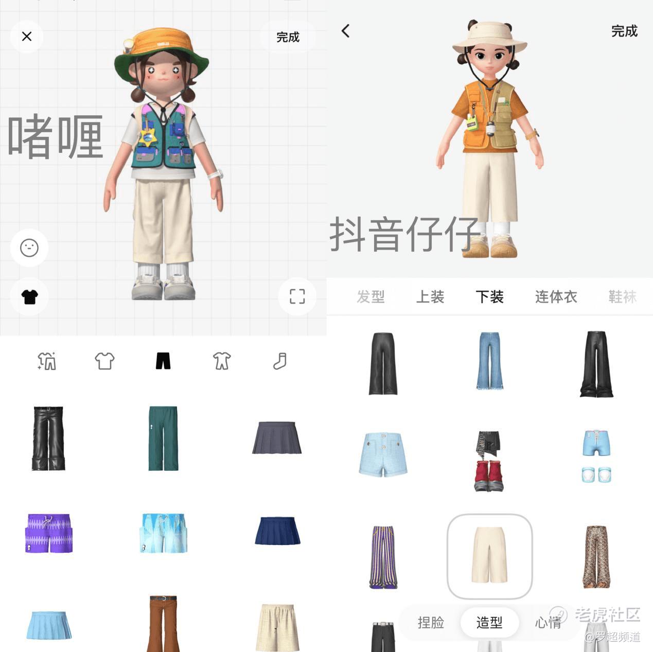 比如换装界面,啫喱用图标表示上装、下装、连体衣、鞋袜,抖音仔仔则换成文字,顺序一模一样,而且很多服装款式都跟啫喱的相似,只不过在具体样式上,“聪明”的设计师有一些微调。