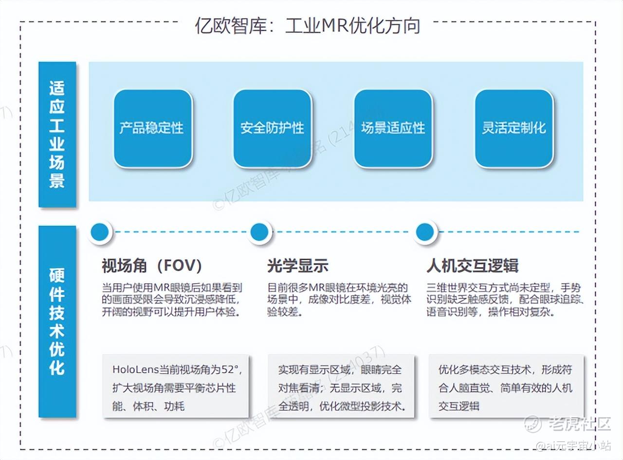 目前,MR硬件和软件都已有相对成熟的产品和落地案例,未来要在工业元宇宙中实现更大规模应用,技术改进方向主要包括视场角、光学显示、人机交互,以及提高设备稳定性、安全性、降低硬件成本以适应工业场景特点等。
