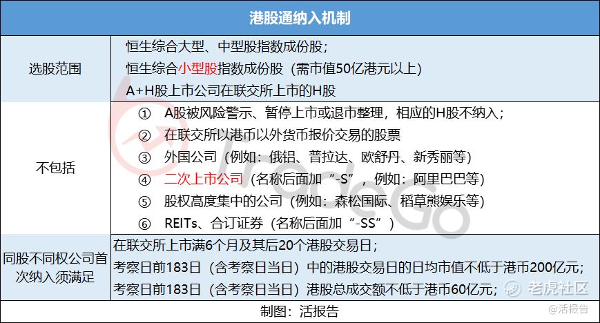 对于同股不同权公司,首次纳入还要满足在联交所上市满6个月及其后20个港股交易日,考察日前183日中的港股交易日的日均市值不低于港币200亿元;考察日前183日港股总成交额不低于港币60亿元。