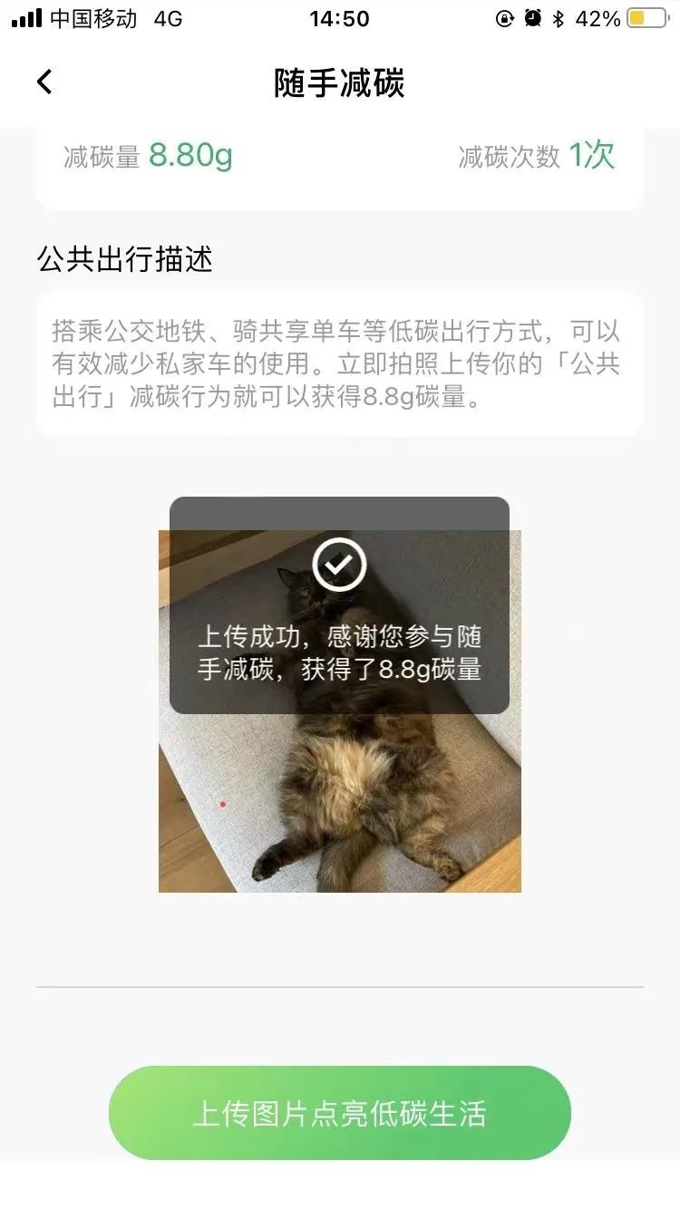 图2 笔者尝试用猫咪照片领取公共出行碳积分并成功相比随手减碳的生活场景,“88碳账户”对低碳商品消费做了更多精细化处理,分别对低碳服饰、低碳食物、替换装、快递包装回收等设定不同的减碳量,更特别针对节能家电,按不同家电类型、能效等级计算相应减碳量。