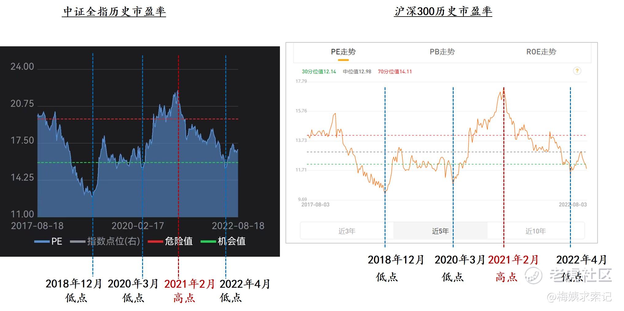 同时我们将中证全指市盈率与沪深300市盈率,分别对应的历史高点和低点做个对比。