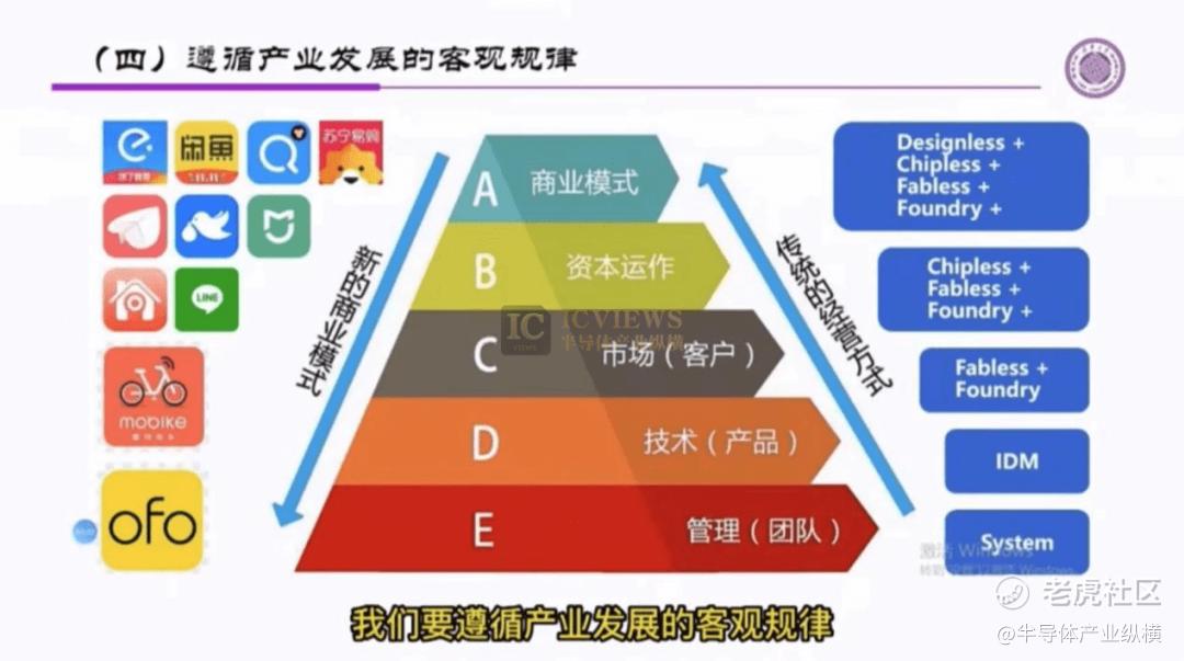 中国也要遵循产业发展的客观规律。国内的产业是从系统公司到IDM到设计加代工等等,这样逐步发展。这些年,也有人探索把互联网的发展模式引入到集成电路。从商业模式的创新,通过资本运作把市场创造出来,并定义产品,最终知道到管理团队来运营。在前期,这种努力和尝试是有益的,但是这样的运行模式并不适应中国集成电路产业的发展,其实也不适应国际集成电路产业的发展,因此,无一获得成果。