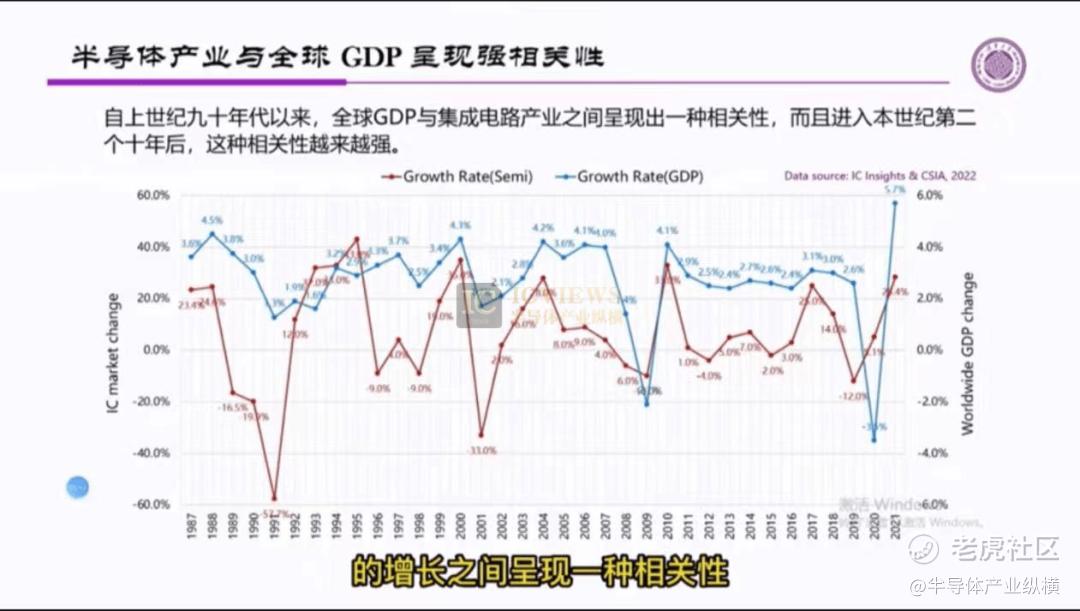 这就很容易让人联想,前面的2.5倍和这里的3.1倍之间存在着某种特定关系。事实上,全球GDP的增长和半导体的增长之间呈现一种相关性。而且进入本世纪第二个十年后,这种相关性应该说是越来越强。
