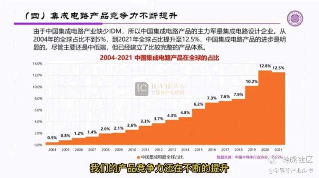 中国自己的集成电路产品,从从2004年中国集成电路产品的全球占比不到5%,到2021年的12.5%,中国集成电路的进步还是很明显的。尽管主要还是在中低端,但已经建立了比较完整的产品体系。去年,中国的产品占全球的比例大约在百分之十二点几,这个数值与国内消耗的35%相比还有很大差距。
