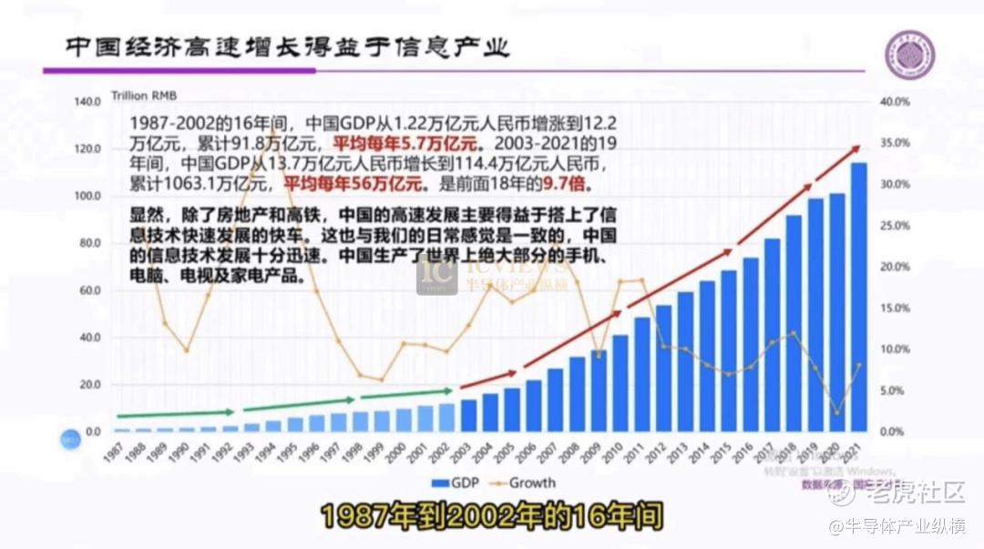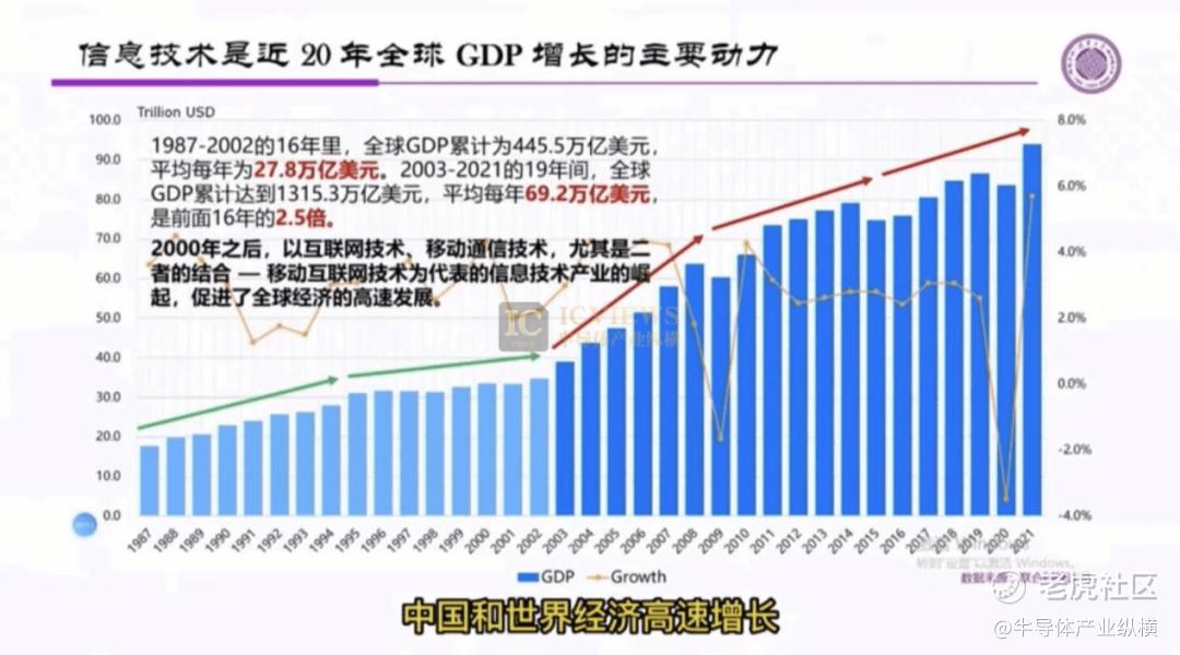 信息技术是近20年全球GDP增长的主要动力。1987年-2002年的16年里,全球GPD累计为445.5万亿美元,平均每年为27.8万亿美元。2003年-2021年的19年间,全球GDP累计达到1315.3万亿美元,平均每年69.2万亿美元,是前面的2.5倍。