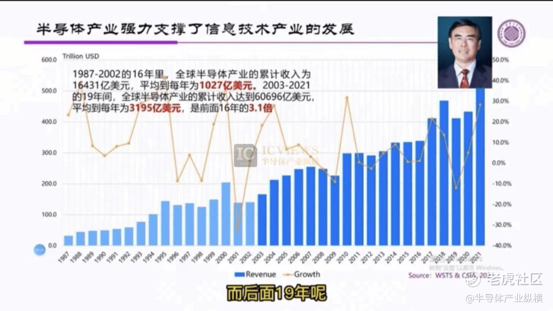 1987年-2002年的16年里,全球半导体产业的累计收入为16431亿美元,平均到每年为1027亿美元。2003-2021的19年间,全球半导体产业的累计收入达到60696亿美元,平均到每年为3195亿美元,是前面16年的3.1倍。