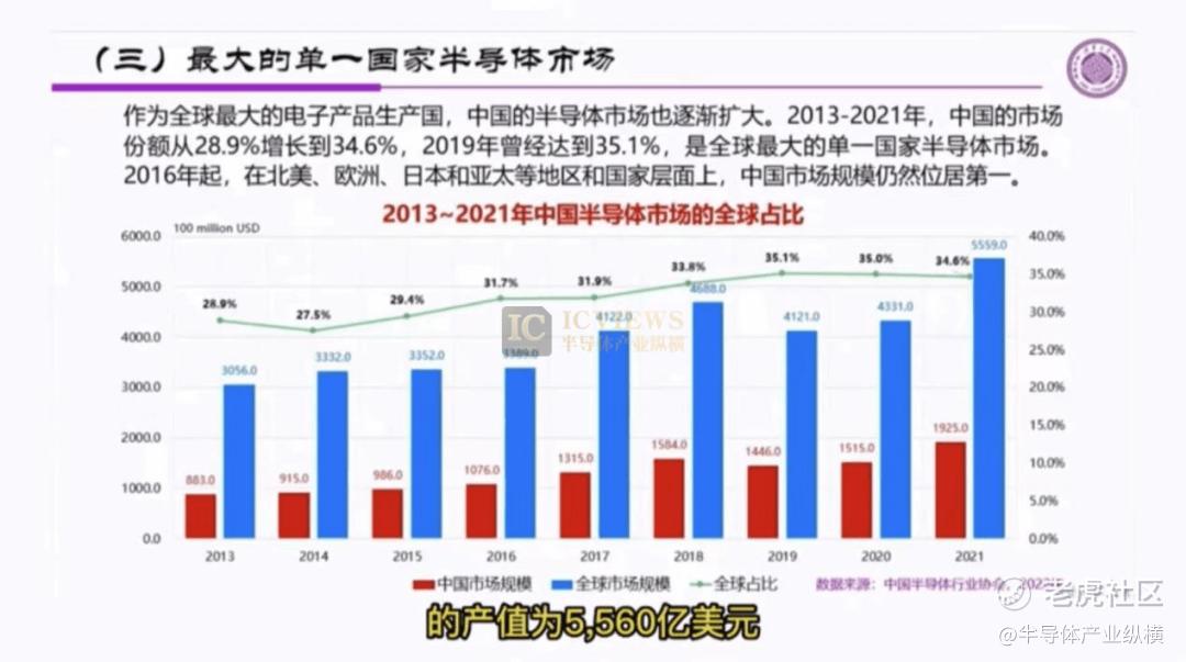 中国是最大的单一国家半导体市场。作为最大的电子产品生产国,中国半导体市场也逐渐增大。2013-2021年,中国的市场份额从28.9%增长到34.6%,2019年曾经达到35.1%,是全球最大的单一国家半导体市场。2016年起,在北美、欧洲、日本和亚太地区和国家层面上,中国市场规模仍然位居第一。