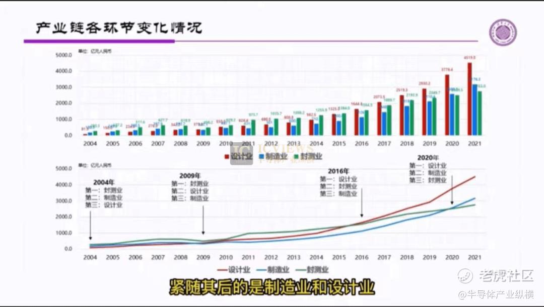 魏少军教授分析,在2004年时封测是半导体行业的最大领域,紧随其后的是制造业和设计业。而2020年制造业又超过封测业。因此现在形成了设计、制造、封测这样的一种产业顺序,产业结构日趋合理。