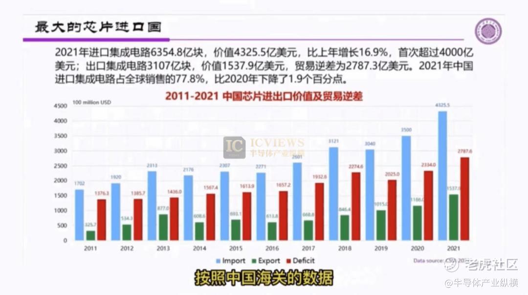 中国是最大的芯片进口国。按照中国海关的数据,2021年进口集成电路6354.8亿块,价值4325.5亿美元,比上年增长16.9%,首次超过4000亿美元;出口集成电路3107块,价值1537.9亿美元,贸易逆差为2787.3亿美元,2021年中国进口集成电路占全球销售的77.8%,比2020年下降了1.9个百分点。魏少军教授说到,这里可以看到,中国进口了78.8%的集成电路,其中将近35%用在了本地,而有40%又在装机当中出口。这就是中国这就是中国作为世界市场的一个重要表象。